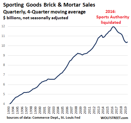 Brick-and-mortar sporting goods stores had been able to defend their stores from online encroachment. But then in 2016, Sports Authority was liquidated, and many of their customers switched to online purchases when their stores closed (not seasonally adjusted data; to eliminate the wild seasonality, I used a four-quarter moving average):