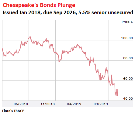 Chesapeake’s series of bond sales that it then undertook included, in January 2018, $1.25 billion of senior unsecured convertible notes with a coupon of 5.5%, due in September 2026. It issued those bonds at a discount, but by July 2018, a few months before Phase 2 of the oil bust set in, the bonds were trading at 103 cents on the dollar. On Friday, the last trade was at 45 cents on the dollar, giving these bonds a yield of over 21% (via TRACE, FINRA’s Trade Reporting and Compliance Engine):