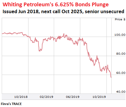 In June 2018, Whiting sold $1 billion of callable senior unsecured bonds, with a coupon of 6.625%. The next call date is in October 2025. Through September 2018, the notes were trading at 103-104 cents on the dollar. Then Phase 2 of the oil bust took its toll. On Friday, the bonds closed at 57.8 cents on the dollar, at a yield of 18.375% (via FINRA’s TRACE):