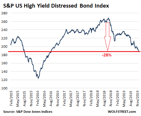 The S&P U.S. High Yield Corporate Distressed Bond Index tracks bonds that trade at a yield that is at least 10 percentage points higher than the equivalent Treasury yield (“Option Adjusted Spread” of 1,000 basis points). Chesapeake’s bond illustrated above, trading at 21%, and Whiting’s bond trading at 18.375% qualify for this index with flying colors. Of the 182 constituents in the index, many are energy bonds. Since November 2018, the index has plunged by 28%: