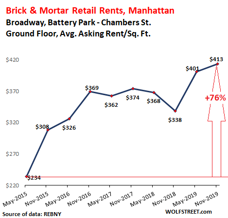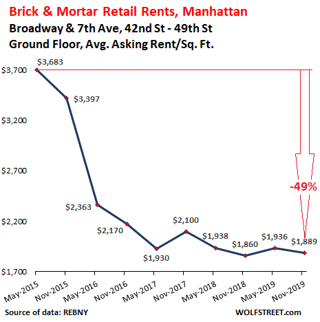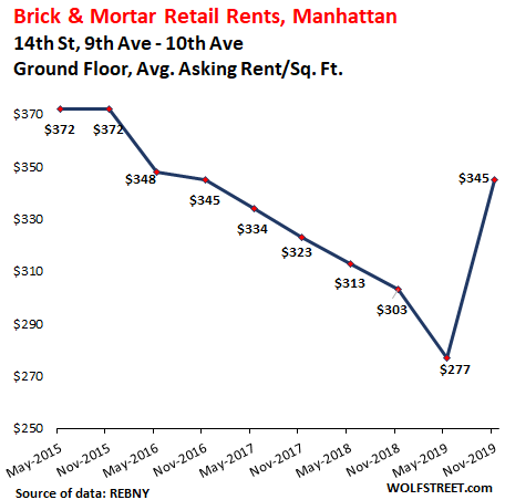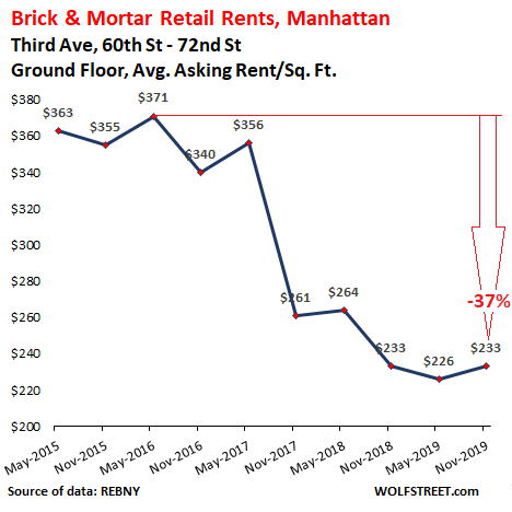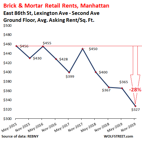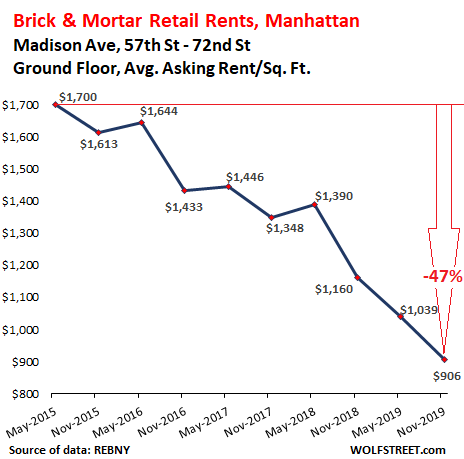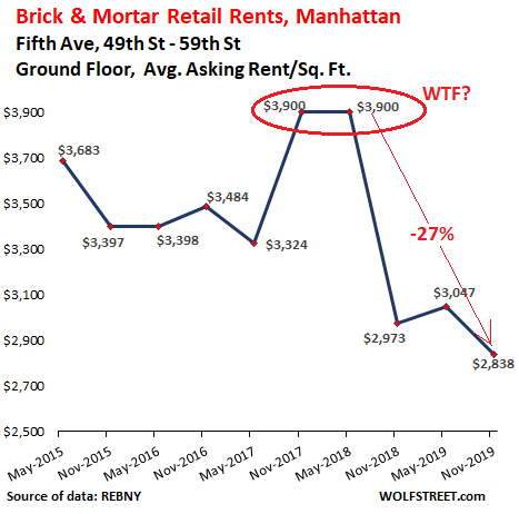These are asking rents. It doesn’t mean that tenants agree to them. In the second half of 2017 and the first half of 2018, valiant but futile attempts were made on Fifth Avenue between 49th Street and 59th Street to ignore reality and ask for record rents, but apparently that didn’t work out, and aspirations then got slashed by 28% in two years: