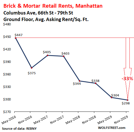 These are major shopping corridors in Manhattan, and in nearly all of them, asking rents for ground-floor retail space have been dropping for years – and in some of them by half.