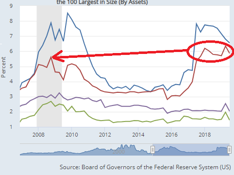 The delinquency rates at the 5,000 smaller banks are an indication of how subprime is doing, as I pointed out in the article, because the large banks have the lion’s share of prime-rated customers, and prime is doing very well. The huge prime credit card balances at the largest banks cover up their issues of subprime, and so the data from the largest banks says nearly nothing about subprime. To see subprime, you have to remove prime, and the smaller banks provide that picture.