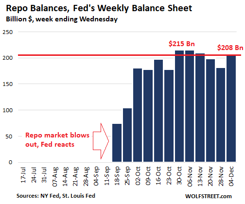 Total amount in repos on the Fed’s balance sheet as of Wed Dec 4 was $209 billion. So what the Fed “pumped” into the repo market was $209 billion, and not $3 trillion or whatever.