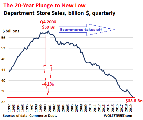 Online retail sales during the holiday shopping season, from November 1 through December 24, soared 18.8% compared to 2018, according to Mastercard SpendingPulse report today. Over the same period, sales at brick-and-mortar department stores, which have been falling dismally since 2001, fell 1.8%.