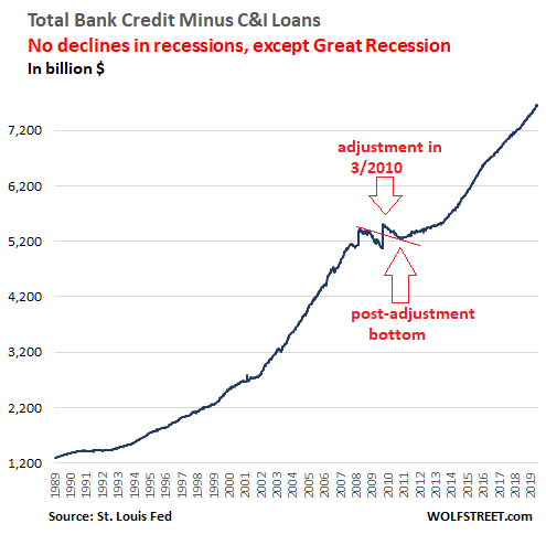 Turns out, in all recent recessions it took the Financial Crisis to get “total bank credit minus C&I loans” to drop at all. During the prior recessions, total bank credit minus C&I loans just flattened out or kept rising. Here is the chart for that, covering the past three recessions (note the big adjustment in March 2010):