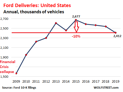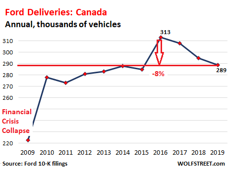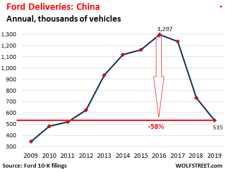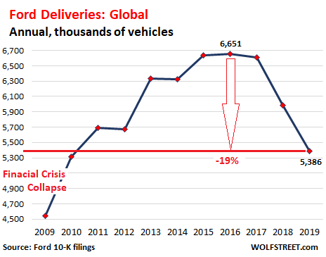 In a moment, we’ll venture into the bitter reality and ugly charts of how the number of vehicles Ford sells in the US, China, Europe, Canada, Australia, South America, Russia, Turkey, and other markets has been dropping – or plunging – year after year to where its global sales are now down 19% from the peak in 2016, as Ford disclosed when it filed its Annual Report (Form 10-K) with the SEC on Wednesday.