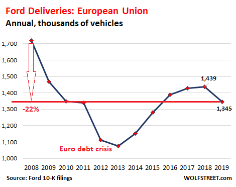 The European Union, Ford’s second largest market. Ford operates there with its subsidiary Ford of Europe, which has its own manufacturing plants and models. Ford of Europe sales peaked back in the day before the Financial Crisis. In 2008, Ford still sold 1.72 million vehicles in the EU. Sales collapsed by 37% through the Euro Debt Crisis to a low in 2013 of 1.08 million units, then rose again to 1.44 million units in 2018. And in 2019, sales fell 6.5% to 1.34 million vehicles, down 22% from 2008, a very hard-to-swallow long-term decline: