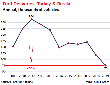 The Turkey and Russia Sales Collapse: While Ford is busy diddling with scooter-sharing services and other dreams, it shut down three assembly plants in Russia in 2019 that made passenger vehicles. It continues to operate a joint-venture plant that makes its Transit van. Auto sales have swooned in both markets, each for their own issues. Honda shut its manufacturing plant in Turkey in 2019. Ford also has factories in Turkey under the Ford Otosan brand but continues to operate them. Ford’s sales in both countries combined have collapsed by 72% since the peak in 2011: