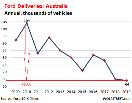 The Australia Fiasco: Ford’s sales in Australia collapsed by 38% since the peak in 2010. This came despite the boom in Australia’s auto market through 2017. Now it’s getting tough all around with total auto sales down 11% over the past two years, but Ford got crushed even during good times: