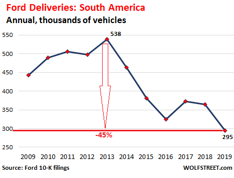 The South America Fiasco: Ford’s sales in South America plunged 45% from the peak in 2013 of 538,000 vehicles to just 295,000 vehicles in 2019: