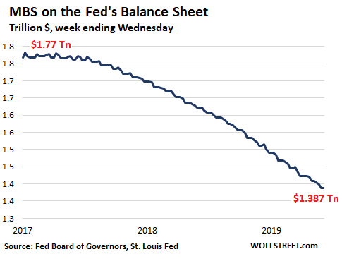 Over the past four weekly balance sheets, the Fed reduced its MBS holdings by $21 billion, to $1.39 billion, the lowest since October 2013: