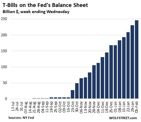 Over the five weekly balance sheets since January 1, the Fed has added $78 billion in T-bills, and the total amount of T-bills on the Fed’s balance sheet has now ballooned to $248 billion: