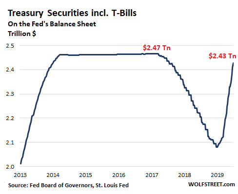 Since January 1, the Fed has fattened its stash of Treasury securities by $99 billion, of which $78 billion are T-bills, and $20 billion are longer-dated Treasury securities. This brings the balance of total Treasury Securities to $2.43 trillion, the highest since February 2018, and well on the way to reversing the QE-unwind of the Fed’s Treasury portfolio:
