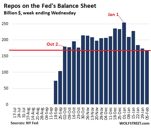 Total repos on the Fed’s balance sheet of February 5, released Thursday afternoon, have plunged by $85 billion from the peak on January 1, to $170 billion, below where they’d first been on October 2: