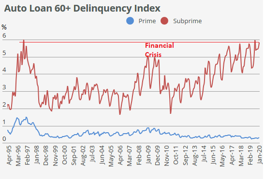 But prime auto loans (blue line in the chart) are experiencing historically low delinquency rates.
