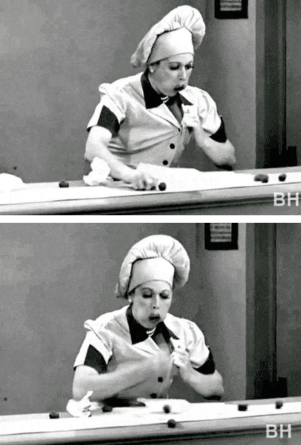 Reminds me of the I Love Lucy episode where she is on the candy production line and unable to keep up with packaging them.