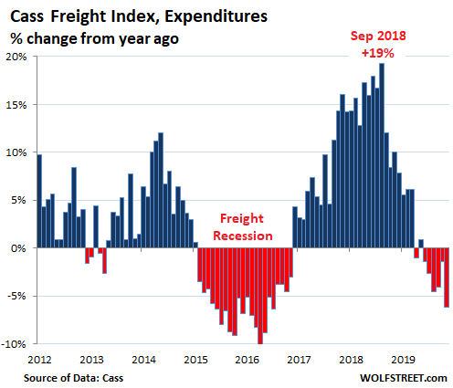 It tracks the amounts that shippers pay to get their merchandise to their customers. Amazon existed in 2018 too, and Cass reported a huge boom in shipments for that year, as you can see in the first chart, the huge blue spikes, peaking with year-over-year volume increases of 12%. So you can eliminate Amazon as cause for the boom in 2018 as well as for the decline in 2019 and now.