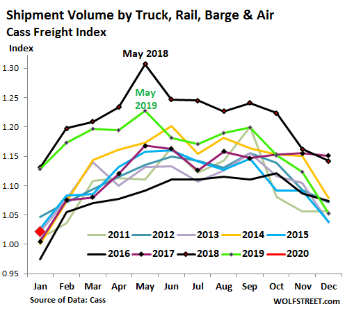 Shipment volume in the US by truck, rail, air, and barge plunged 9.4% in January 2020 compared to the already weak January a year earlier, according to the Cass Freight Index for Shipments. It was the 14th month in a row of year-over-year declines, and the steepest since October 2009, during the Financial Crisis: