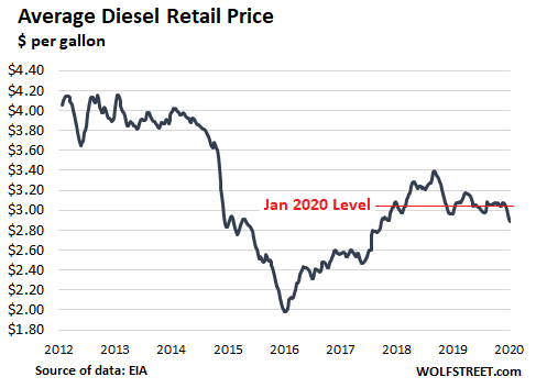 The average retail price of diesel in January across the US, at a few cents over $3.00 a gallon, was up about 2% from the average a year earlier, according to EIA data (though in February, the price has dropped below last year’s level):