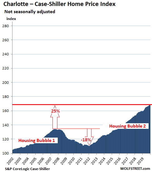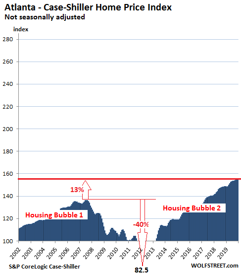 House prices in the Atlanta metro edged down 0.1% in December from November and were up 4.1% year-over-year. During Housing Bust 1, the index had plunged 40% to an index value of 82.5 in March 2012, back where it had been in 1996. But since then, it has surged 88%: