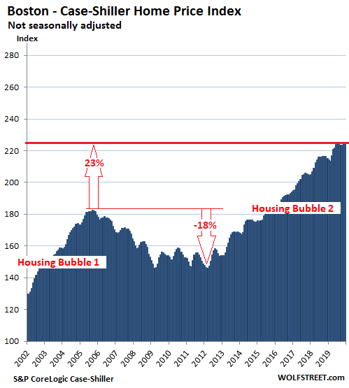 The Case-Shiller index for the Boston metro has remained essentially flat for five months and was up 2.6% year-over-year. Boston’s index value of 256 means that house prices rose 156% since January 2000: