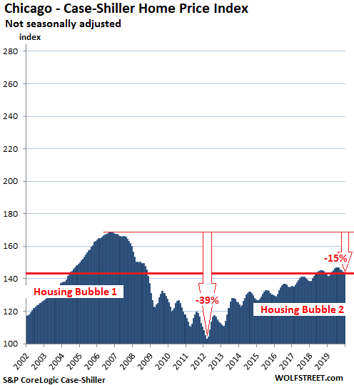 House prices in the Chicago metro – the counties of Cook, DeKalb, Du Page, Grundy, Kane, Kendal, McHenry, and Will – ticked down 0.1% in December from November and were up 1.0% from a year earlier, and back where they’d been in May 2018: