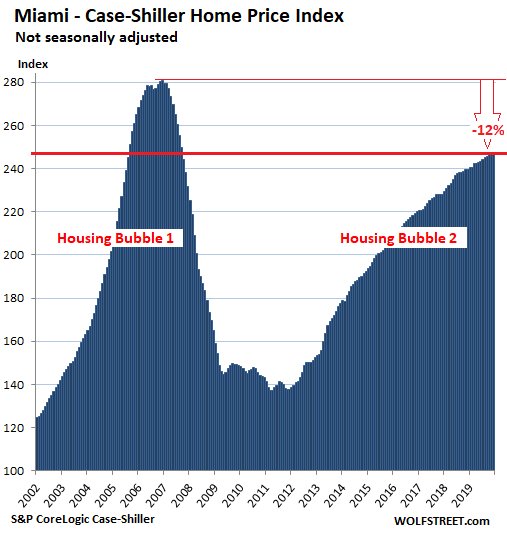 Single-family house prices in the Miami metro edged up 0.1% in December from November and rose 3.2% year-over-year. The index is still down 12% from the craze at the end of 2006. Note that the index doesn’t track condos; but in the condo market, oversupply of newly built luxury units is creating very tough dynamics.