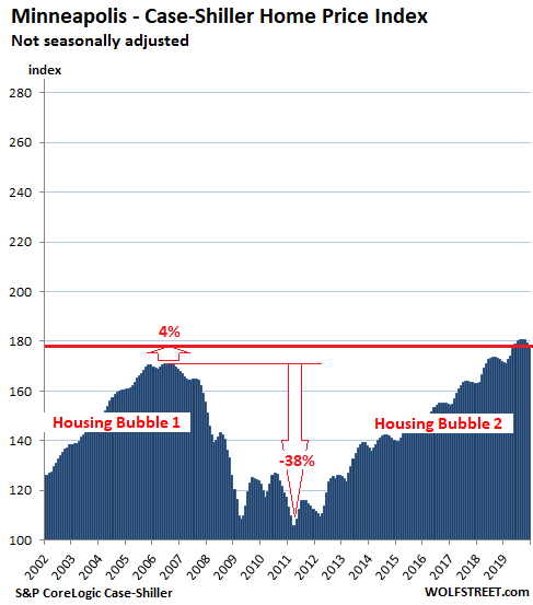 The Case-Shiller Index for the Seattle metro ticked up 0.2% in December from November but remains below where it had first been in May 2018. Also note the double peak: