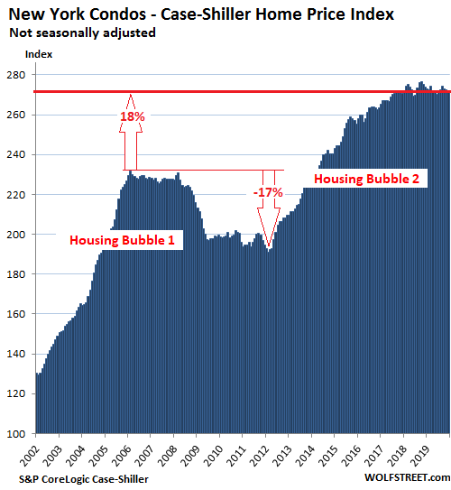 Case-Shiller uses a custom area for its New York City index that includes numerous counties in the states of New York, New Jersey, and Connecticut “with significant populations that commonly commute to New York City for employment purposes.” This area is far more diverse than Manhattan by itself, and the turmoil in the Manhattan condo and co-op market amid rampant oversupply of newly built high-end units is only one of many factors impacting the index.