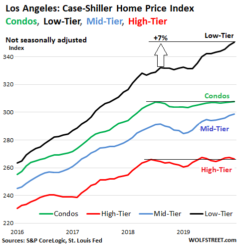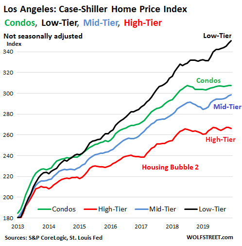 Today we’re diving into the price layers of the index, and into the condo price index, which the Case-Shiller Index also provides for Los Angeles (data via St. Louis Fed’s FRED database): Turns out, at the “low tier,” meaning the bottom third, prices have surged ginormously and continue to surge, but the “high tier,” meaning the top third, and the condo market have hit rough waters.