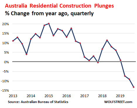 Construction activity in Australia slumped by 3% quarter on quarter in the fourth quarter of 2019, the Australian Bureau of Statistics (ABS) reported this week. Compared to the same quarter of 2018, construction activity fell 7.4%. It was “a weak end to what was a weak year for the construction sector,” said Westpac senior economist Andrew Hanlan. The sector, which accounts for 13% of Australia’s GDP, has been in cyclical decline since mid-2018, as the Australia’s housing bubble began to deflate and feed through into the construction industry.