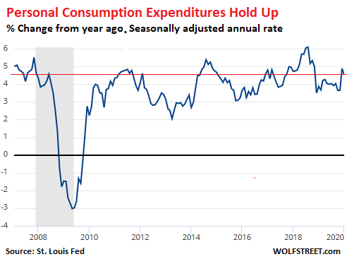 Personal consumption expenditures include nearly everything consumers spend in the US for goods and services but also mortgage interest payments which are part of “rent.” But it does not include what they send or spend overseas.