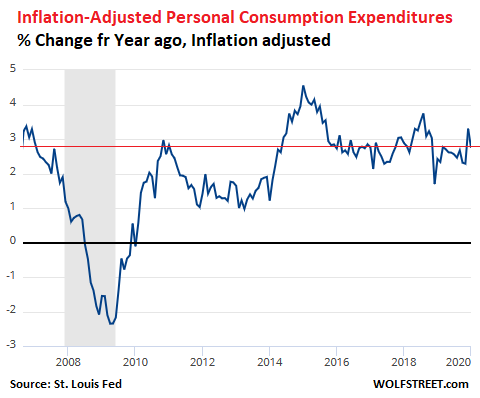 No (see chart above). And not even on an inflation adjusted basis (see chart below): “real” consumer spending grew 2.8% year-over-year in January and grew between 2.4% and 3.3% yoy every month in 2019. This is what the year-over-year growth rate of inflation-adjusted consumer spending looks like: