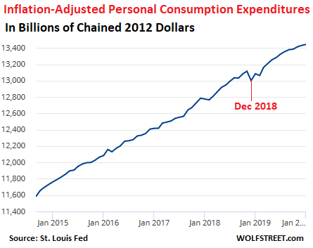 Yes, there was a huge drop in Dec 2018. But spending has surged since then and has gone far beyond it. The chart below shows “real” consumer spending in billions of 2012 dollars. You can see the big drop in Dec 2018 that you pointed out, but you can also see how spending surged from there even on an inflation-adjusted basis.