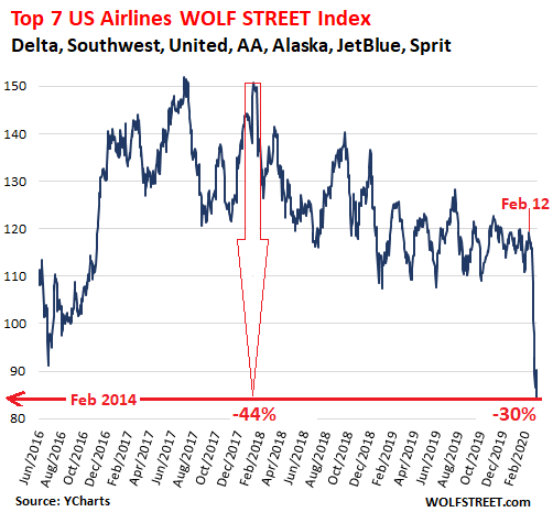But the plunge got going seriously after February 12, essentially forming a straight line down, with the value of the top seven US airlines plunging a combined 30% in 15 trading days (market cap data provided by YCharts):