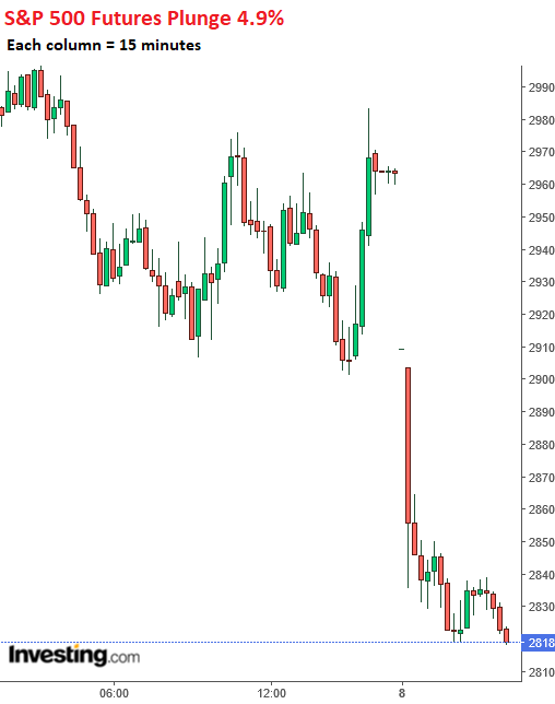 US stock futures plunged in overnight trading, with futures on the Dow Jones Industrial Average down 1,222 points, or 4.7%; with the Nasdaq futures down 4.8%, and with S&P 500 futures down 4.9%: