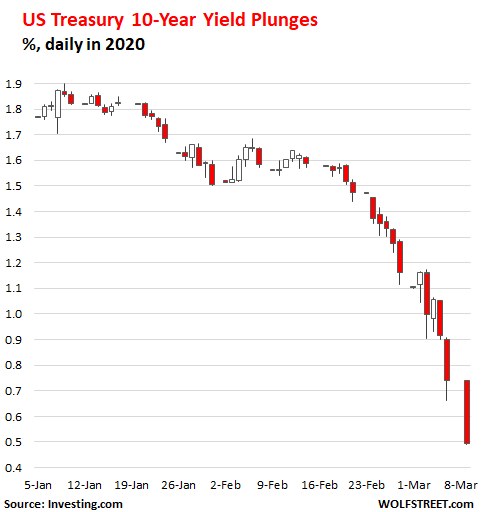 Under huge demand by spooked investors trying to flee risky assets, 10-year Treasury prices rose and the yield plunged 25 basis points from the record-low close on Friday, following the plunge on Friday and the plunges on prior days. Sunday night, the yield fell to 0.496%.