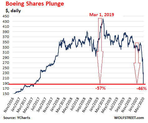 Boeing’s shares [BA] came unglued, plunging 18.1% today, after having already plunged over the past four weeks. Since February 12, shares have crashed 46%, and since the peak on March 1, 2019, 57%: