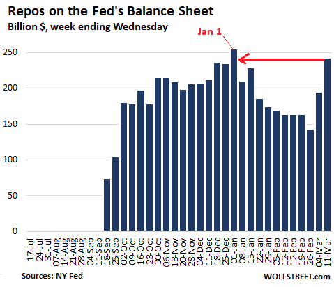 These increases are reflected on the Fed’s weekly balance sheet released today. Repos soared from $143 billion two weeks ago to $242 billion, nearly back where they’d been on January 1 ($256 billion). Note how the repo balances had been declining from the beginning of the year, dropping by 44%, until the stock market began to crash and the Fed opened the vault: