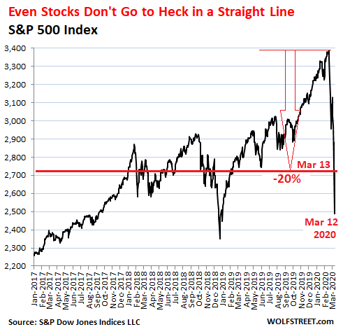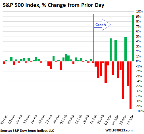 Holy moly, that was fast and whiplash inducing. Today, the S&P 500 exploded higher by 9.3% to 2,711, nearly erasing yesterday’s 9.5% plunge, which had been the steepest plunge since the 22.6% DOW collapse on Black Monday in 1987, which had been the steepest in history. Today’s action was a classic bear-market rally. Even I could see it coming after yesterday’s plunge. “That was fast, too fast,” I mused yesterday, as the S&P 500 Index was going to heck in a straight line. But that is simply not possible, according to our proven-beyond-a-scintilla-of-doubt and utterly indisputable WOLF STREET beer-mug dictum: “Nothing goes to heck in a straight line.”