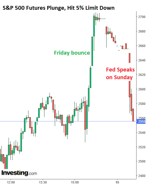 Upon the panicked Sunday afternoon announcement by the Fed, S&P 500 futures plunged 5% to hit limit down, and for now remain stuck at the limit down, which might make for, let’s say, an interesting Monday morning: