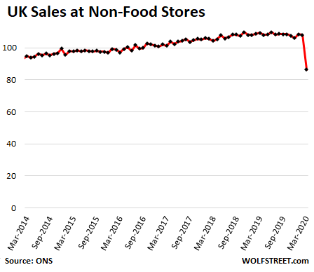 Non-food stores are broadly considered non-essential and have therefore been closed since March 23, when the UK’s lockdown began. They’d already been through a sharp decline in the second half of 2019, as some large department store chains entered the UK equivalent of a bankruptcy restructuring. This was followed by an uptick early this year. The first half of March was likely in that range. But the lockdown did a job on them. In April, they’re faced with near-zero sales: