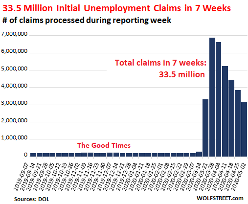 State unemployment offices have processed a gut-wrenching 33.48 million initial claims for unemployment insurance over the seven reporting weeks since mid-March. In the week ended May 2, state unemployment offices have processed 3.169 million unemployment claims, seasonally adjusted, according to the US Department of Labor this morning.