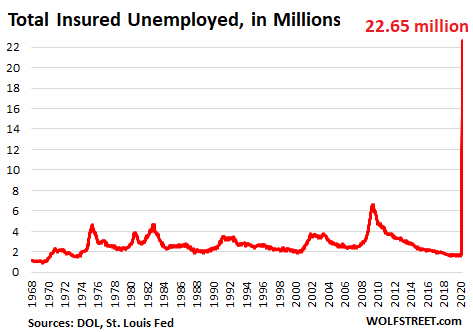 The number of people that make up the “insured unemployed” spiked to 22.647 million for the week ending April 25, about 3.5 times the record of the era before The Virus – 6.63 million in May of 2009: