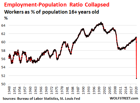 The Employment-Population Ratio collapsed by 8.7 percentage points in April from March, to 51.3%, the lowest ratio in the history of the data going back to 1948. This ratio, based on household surveys, shows the percentage of people who have jobs compared to the overall working-age population (16 years and older). It includes full-time, part-time, and gig workers.