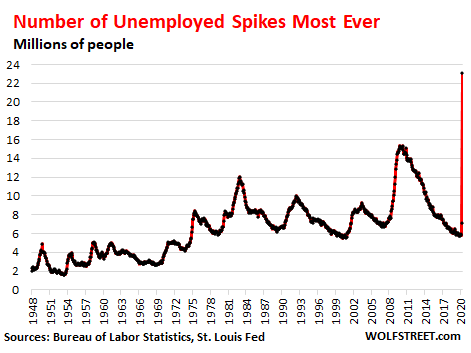 The number of unemployed people, based on household surveys, spiked by 15.9 million in April, the biggest monthly increase ever, to 23.1 million people, the largest number of unemployed ever: