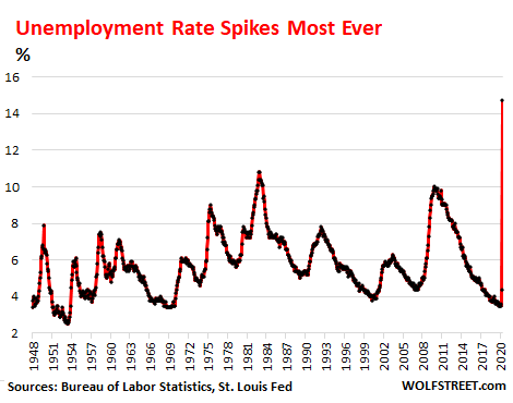 The unemployment rate spiked over 10 percentage points in April from March, the largest monthly increase in the history of the data going back to 1948, to 14.7%, the highest unemployment rate ever in the data: