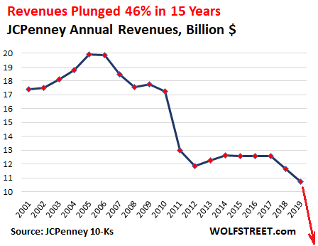 Yup, it finally happened. J.C. Penney announced Friday afternoon that it had filed for Chapter 11 bankruptcy protection, after nine years straight of net losses, totaling $4.5 billion. Its revenues plunged from nearly $20 billion in fiscal year 2006 to $10.7 billion in its last fiscal year ended March. Now its stores are closed, and when the stores reopen, it will be closing more stores permanently, and there will be even fewer customers. And sales this year will collapse, to perhaps less than half of the $10.7 billion (red arrow):