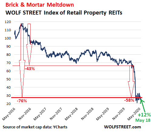 But despite that one-day surge, the index remains down 76% from the peak in July 2016. This collapse of the sector came in two phases: Phase one, from July 2016 to February 22, 2020, the relentless brick-and-mortar meltdown that has been going on for years, powered by the shift of retail sales to ecommerce, resulting in tens of thousands of stores being shuttered over the past four years; and phase two, from February 22 onward. In phase one, the index plunged 43%. In phase two, it plunged 58%, including today’s 12.4% surge to 27.9 (market cap data via YCharts):